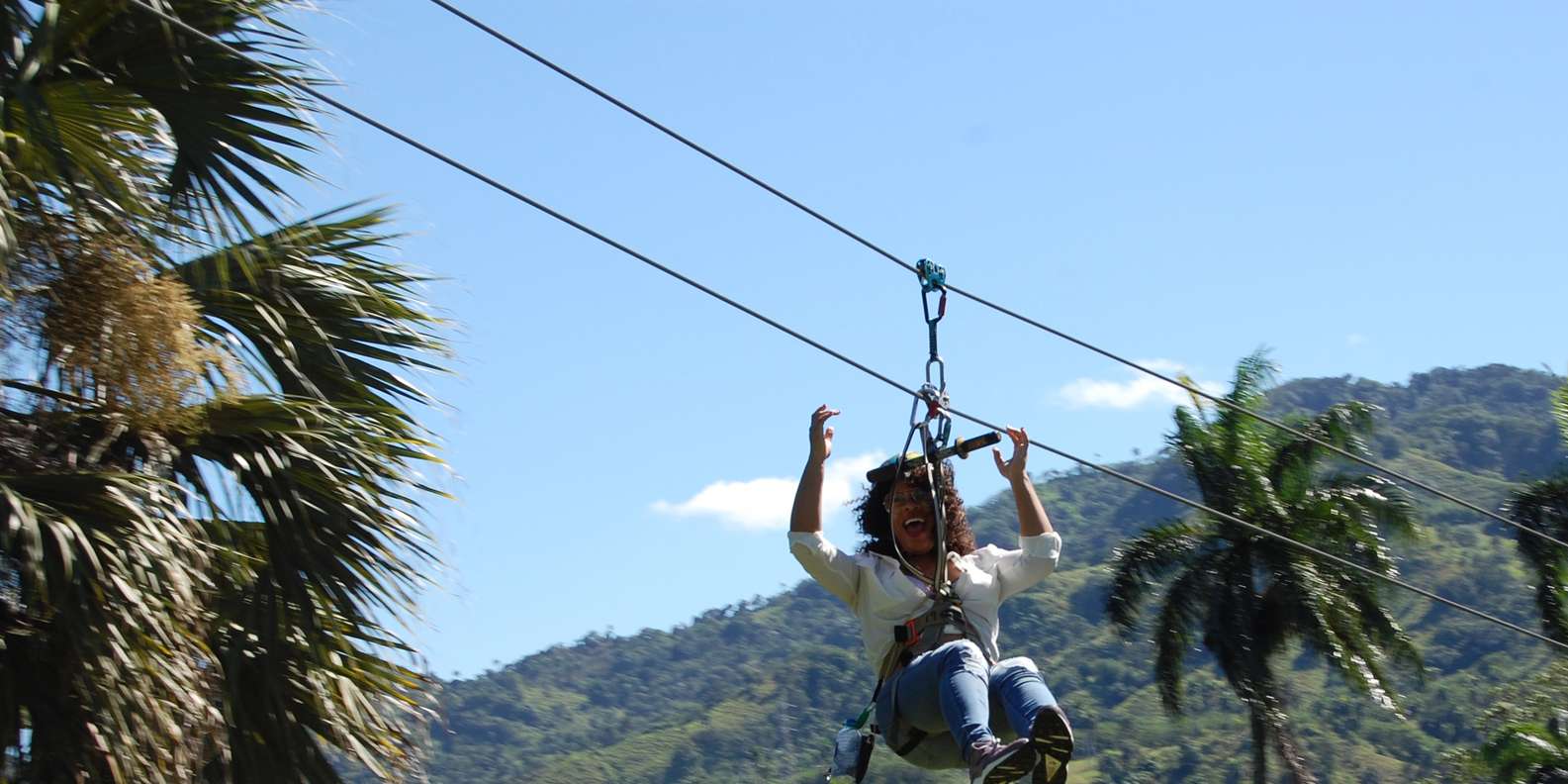 Travel by zip lines across a lush tropical mountain range