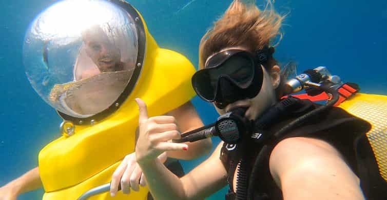 The submarine motorized scooter is based on the same theory and as you go down a seal is formed around your helmet so you are dry inside the helmet bubble. This experience is excellent for those who need to use prescription lenses. The motorized scooter does not have uncomfortable constraints or conventional dive equipment.